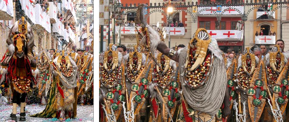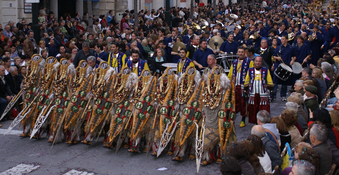 El diseño del traje con grises, rojos, ocres y verdes no hacía prever el impacto de unas cabezas camufladas de las cuales colgaban unos colmillos que aún les daba un mayor impacto. El traje era rematado por unos collares y abalorios de multicolor. Los sones de una atrevida marcha mora titulada “Abencerraig” del compositor Saúl Gómez e interpretada por la Banda de Campello les acompañaba en su entrada por la calle de San Nicolás, tupida de público y fotógrafos que en muchos tramos no les dejaba ni avanzar.